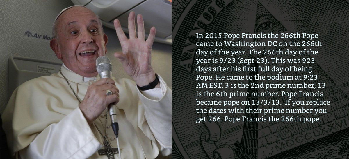 In 2015 Pope Francis the 266th Pope came to Washington DC on the 266th day of the year. The 266th day of the year is 9/23 (Sept 23). This was 923 days after his first full day of being Pope. He came to the podium at 9:23 AM EST. 3 is the 2nd prime number, 13 is the 6th prime number. Pope Francis became pope on 13/3/13. If you replace the dates with their prime number you get 266. Pope Francis the 266th Pope.