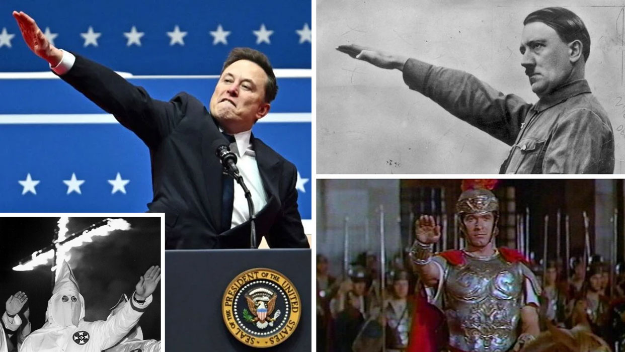 Elon Musk behind the presidencial seal of Romerica, Klu Klux Klan, and Adolf Hitler giving the Roman salute.