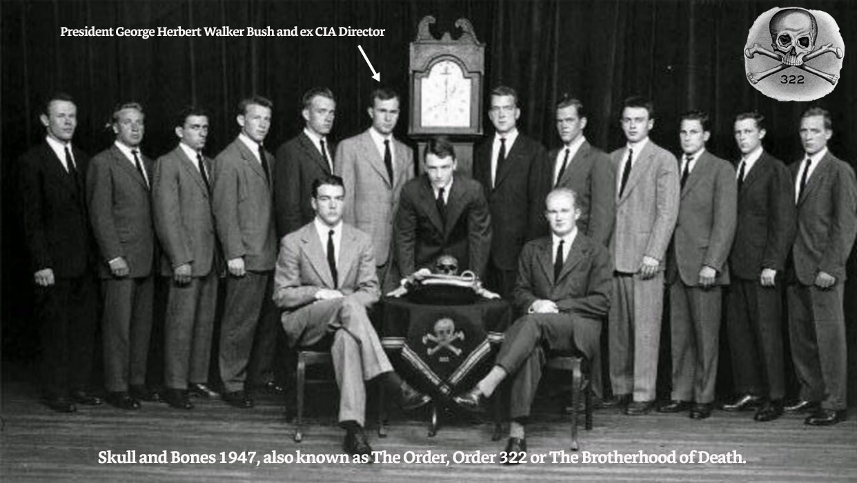 The Skull and Bones symbol is the same as the pirate icon, and incorporates the numbers 322, and is the number of the order, and believed to be a reference to Genesis 3:22. There are many group photos on the web of members behind a table with the alleged skull and bones of the American indian leader Geronimo. Many prominent figures including presidents have been members of the occult society including Prescott Bush who reportedly funded the rise of the Nazi regime during WW2, who was the grandfather of George H.W. Bush (ex-head of the CIA and 2 term US president) who was behind the first Iraq war of the 90's, and his son George W Bush (also, two term president), and responsible for the invasion of Iraq and Afghanistan on the unfounded pretext that both countries were responsible for the 9/11 attacks.