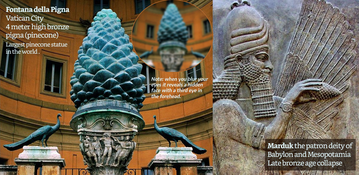 The Pinecone: the symbol of the seed that will pollinate the entire world with their doctrine. Note: The serpent sows seeds of lies & deception in the garden: Genesis 3 - Jesus speaks to this in 'The Parable of the Sower' Matthew 13:18-30. Jesus sows the good seed but he speaks to an enemy who crept in whilst men slept and sowed tares among the wheat. There are many ancient relief's with deities holding the pine cone in the hand as we see in the image of the Babylonian deity Marduk above.