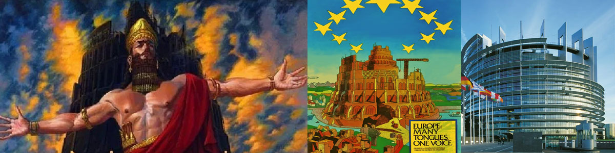 Advert for EU parliament Brussels fashioned on the tower of Babel - Note the upside down pentagrams (stars, angels, messengers, spirits) descending (falling) on the building and block head society. Also note the child with a round head as though not yet hewn, that is, innocent and not yet cut and shaped (initiated) like the others i.e. socially engineered, indoctrinated. The slogan 'Many Tongues, One Voice' a direct nod to Babel (confusion) where the people were of a united mind (confederacy) to complete the task of Nimrod who represents tyranny and a One World Government/Religion [church, state] without God and Christ's precepts.
