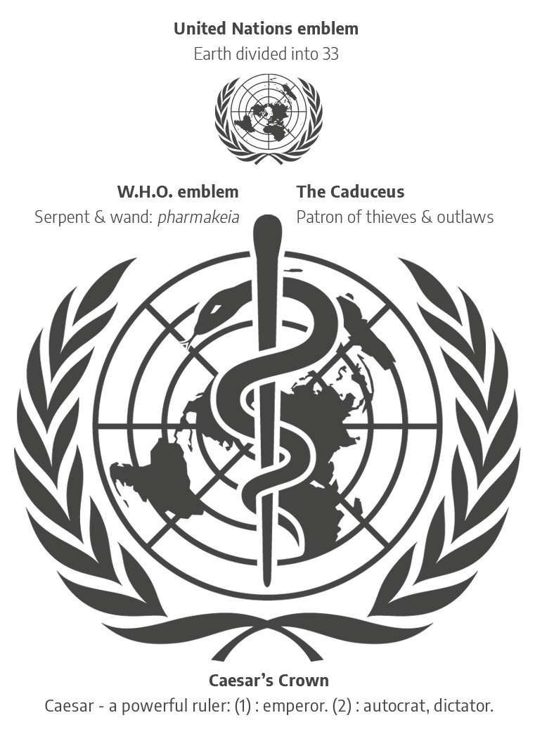 It is of my opinion that the W.H.O. emblem represents an enabler and enforcer of experimental drugs on the world population through the means of fear, deception and propaganda as was witnessed during the 2020 so-called "pandemic". It's sole purpose to covertly depopulate via so-called vaccines and pills such as Statins. There is a vast fortune to made from vaccines with major funder of the W.H.O. and GAVI Vaccine Alliance and philanthropist, William Gates III who openly bragged on American TV that he gets a 20/1 return on his vaccine investments which would explain why he called his pandemic enactment movie 'Event 201' which was released in October 2019 just months before the drill went live with international lockdowns. I'm sure there are plenty of investors who look to Gates for inspiration especially with such high returns. There are also those who have been indoctrinated to believe that the earth is over populated, another opinion held by Gates, and the members of the Club of Rome crowd with their NetZero carbon narrative (us being the carbon), all to "save the planet". It is the Darwinism "survival of the fittest" narrative used as a desperate attempt to justify their actions as it always is with eugenicists. All these dangerous ideologies and beliefs seer the conscience and remove empathy, compassion only to be replaced with selfish vain incentives such as medals, honourifics, and knighthoods, not to mention financial and promotional rewards.
