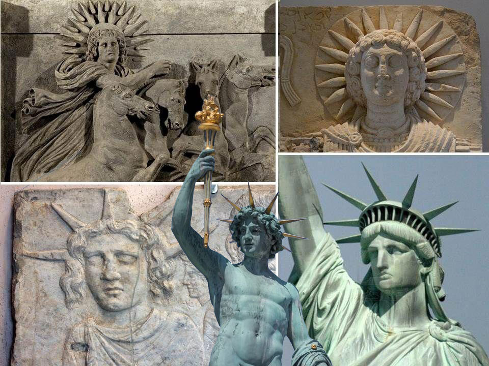 Apollo, Sol Invictus, Mithra and the Greek Helios becomes a very solem man-faced Lady Liberty.