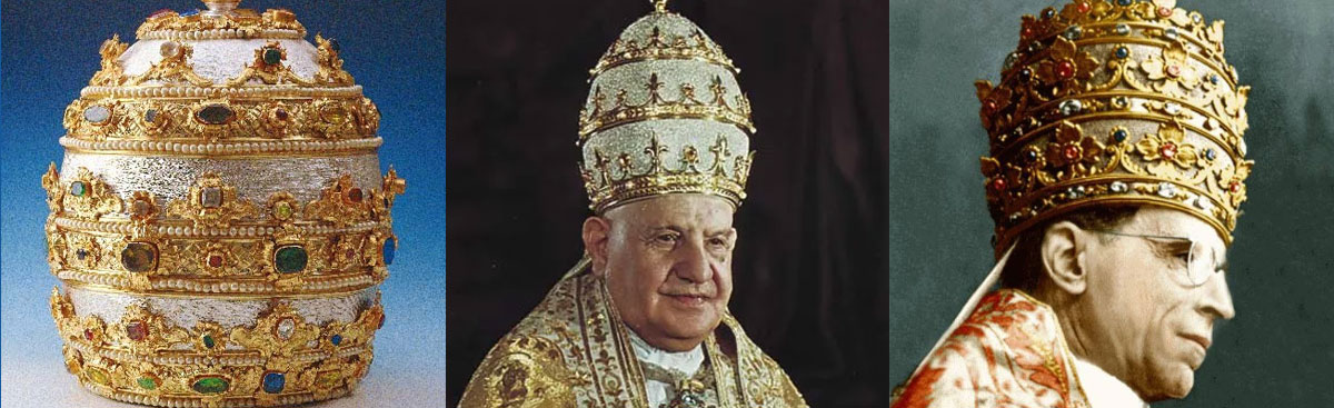 The Triple Tiara: The Pope's triple tiara, or triregnum, is a ceremonial headdress with three crowns that symbolized the Pope's temporal power as "father of kings," "governor of the world," and "Vicar of Christ". It was worn by popes for centuries, but the last pope to be crowned with it was Paul VI in 1963, after which its use was largely abandoned in favor of a simpler inauguration. The tiara's development reflects the growing power of the papacy, symbolizing supreme authority. The three crowns in one are believed to represent the Pope as king over heaven, earth and hades (Hell or the Underworld).