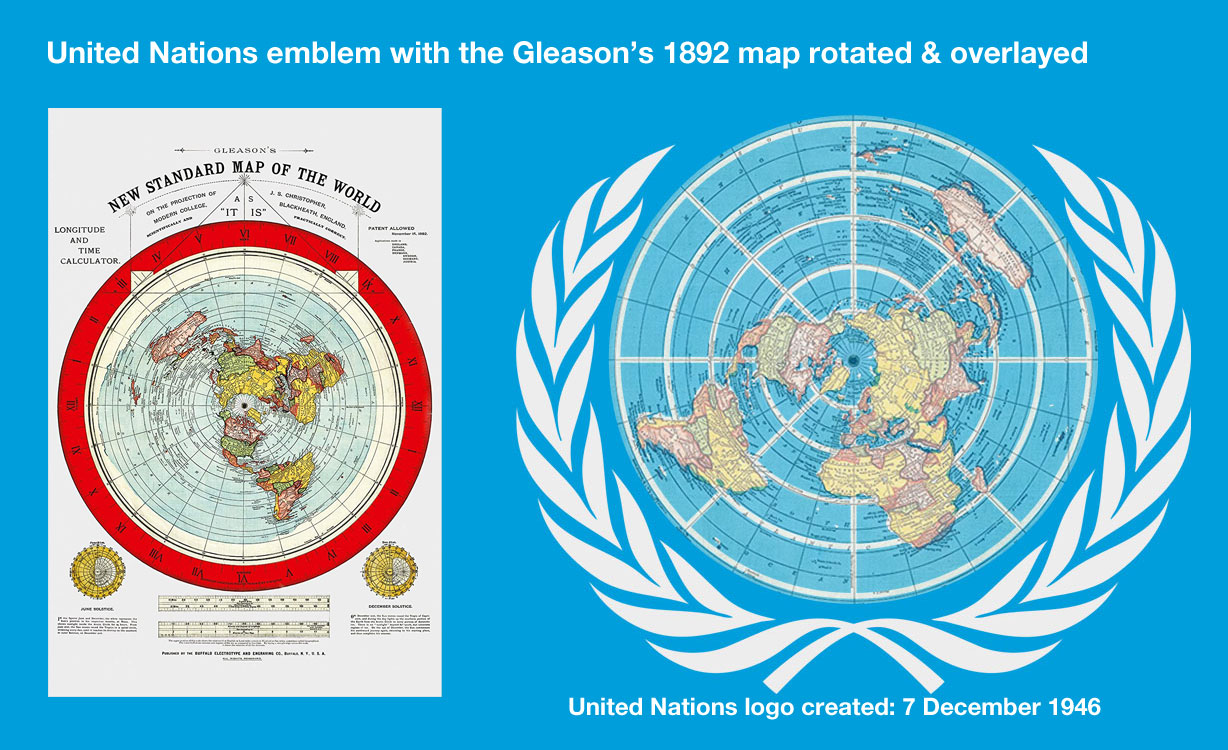 The map used in the emblem matches the Gleeson's flat earth map published in 1892. Fascinating that the UN would choose to use a flat earth map for their emblem when today it is considered a taboo subject, just the mere mention of flat earth in some circles will trigger responses that will get you ridiculed, humiliated and earn you an establishment label such as flat earther, tin foil hat wearer, conspiracy theorist etc. Perhaps it wasn't such a sensitive subject back in 1946 when the emblem was designed? It depicts the entire known earth encompassed by the crown of Caesar, and may be pointing to Revelation 20:9.